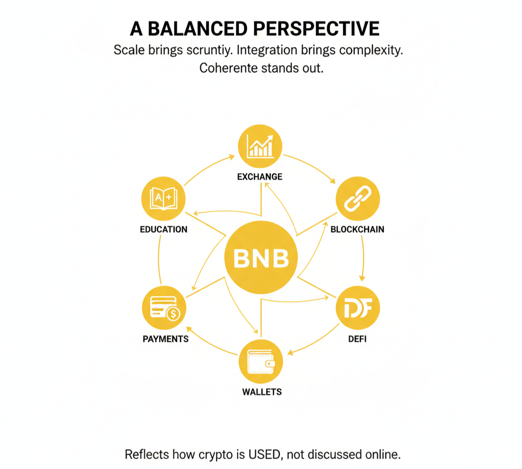Ekosistem Binance tidak tanpa tantangan, dan mengakui hal itu adalah bagian dari pandangan yang matang. Skala membawa perhatian, dan integrasi membawa kompleksitas. Namun, yang menonjol adalah koherensi. Setiap lapisan — pertukaran, blockchain, DeFi, dompet, pembayaran, pendidikan — memperkuat yang lainnya.