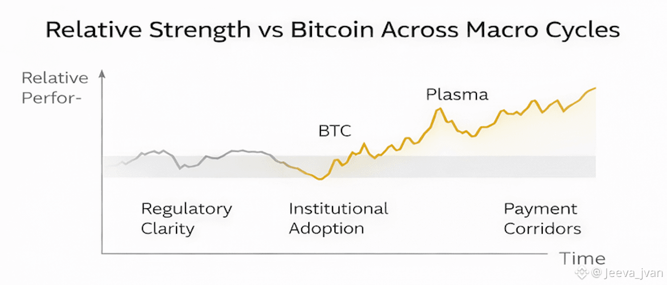 Relative to Bitcoin, infrastructure-focused projects like Plasma often find strength during macro phases dominated by regulatory clarity, institutional adoption, and treasury tokenization rather than meme-driven speculation. A relative-performance view across cycles would likely show Plasma-style narratives outperforming when capital rotates toward durability and compliance, while underperforming during periods of retail frenzy. That dynamic would frame Plasma as a macro-sensitive asset whose fortunes rise with the institutionalization of crypto rather than with social media sentiment.