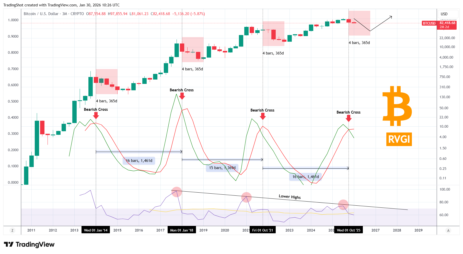 Yang bahkan lebih menarik adalah bahwa setelah setiap RVGI Bearish Cross, bagian bawah Siklus Beruang terjadi tepat dalam 4 kuartal, yaitu 1 tahun. Ini secara teknis mengkonfirmasi ekspektasi jangka panjang kami dari analisis sebelumnya bahwa Siklus saat ini harus mencapai titik terendah sekitar Oktober 2026.