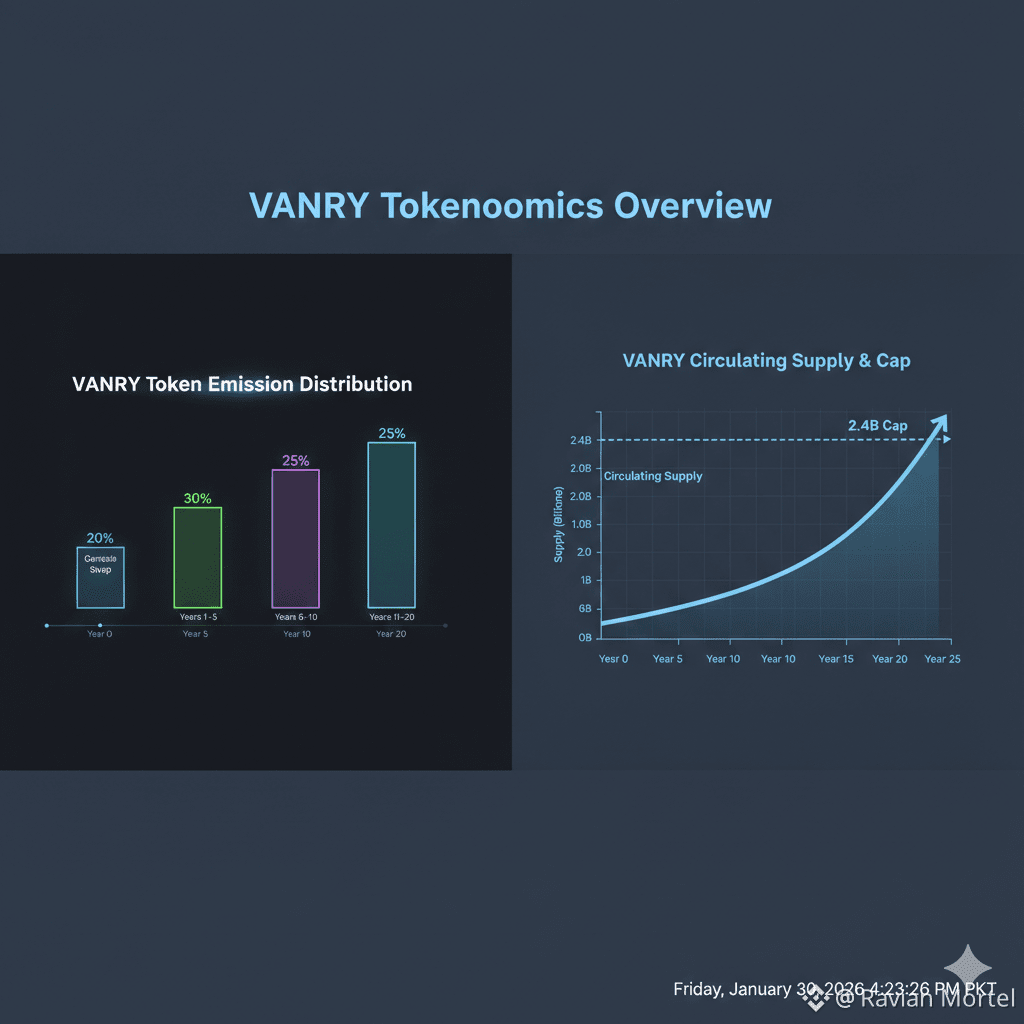 Now let’s talk about the token, because VANRY is the fuel that ties the whole thing together. Public trackers list the max supply at 2.4 billion, and they show the circulating supply sitting a bit over 2.2 billion.