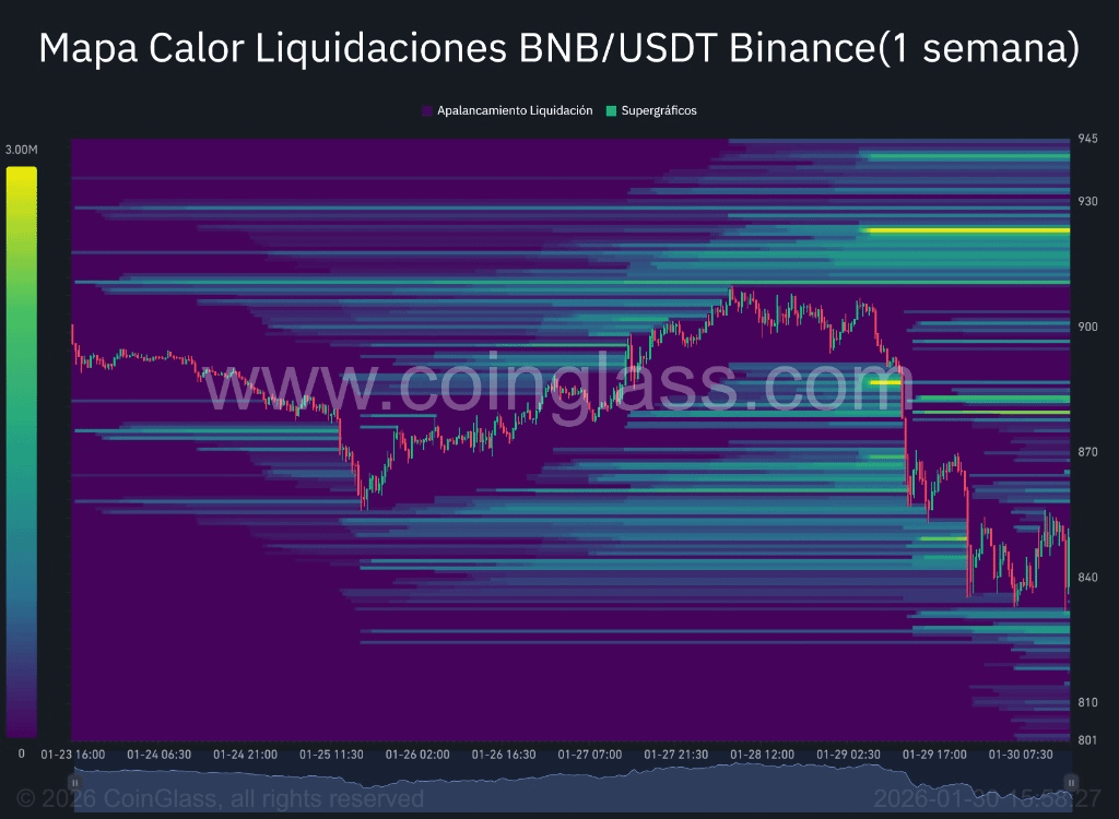 Peta baru: Setelah likuiditas bearish itu diambil, peta menunjukkan bahwa blok minat yang paling kuat sekarang berada di atas harga, khususnya antara 880 dan 900 USDT. Jika dukungan bertahan, harga bisa mencari likuiditas atas tersebut karena efek magnetik.