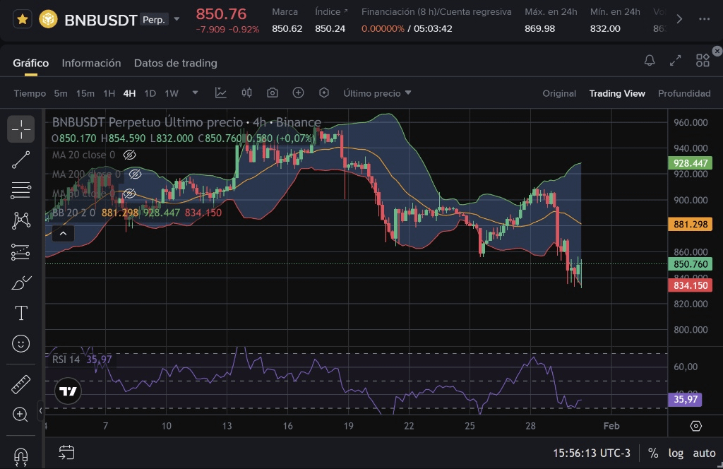 Namun, harga tidak jatuh ke dalam kekosongan: telah terhenti di zona 830 - 850 USDT. Area ini sangat penting karena berfungsi sebagai "lantai" struktural sebelum Rata-Rata Bergerak 200 periode (garis merah di ~790 USDT), yang masih menjadi batas akhir dari tren bullish makro. Kita berada dalam fase kompresi bearish yang mencari dasar.