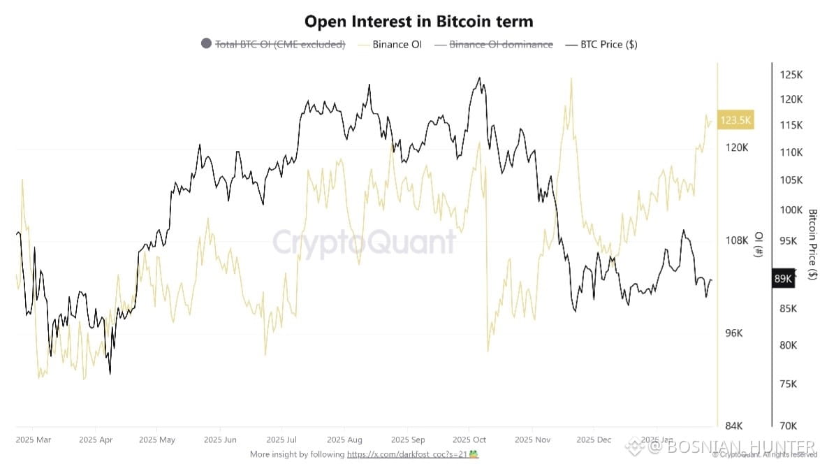Futures positioning: mixed but rebuilding The decline triggered roughly $800 million in liquidations over the past 24 hours — the biggest single-day wipeout since late November 2025 (when BTC was last near $81K).Still, analyst Darkfost notes Binance open interest has climbed to 123,500 BTC — well above the October 10, 2025 low of 93,600 BTC (a ~31% increase). Traders appear to be rebuilding exposure instead of fully capitulating.Broader activity has cooled: January monthly BTC futures volume across exchanges hit around $1.09 trillion — the lowest since 2024. Volume remains concentrated on top platforms: