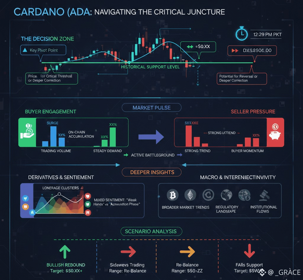 Scenario analysis can help frame expectations. In a favorable scenario, ADA stabilizes above its critical pivot zone, attracting renewed buying interest and potentially setting up a period of consolidation before attempting higher levels. In such a scenario, confirmation might come through upward breaks of short-term resistance and sustained volume, signaling confidence in the recovery. In a less favorable scenario, failure to maintain this level could accelerate declines, particularly if stops or leveraged positions are triggered, pushing price toward lower historical supports. A neutral scenario is also possible, in which ADA moves sideways within a defined range, allowing supply and demand to rebalance before a decisive move occurs. Each of these paths carries implications for risk management and strategy.