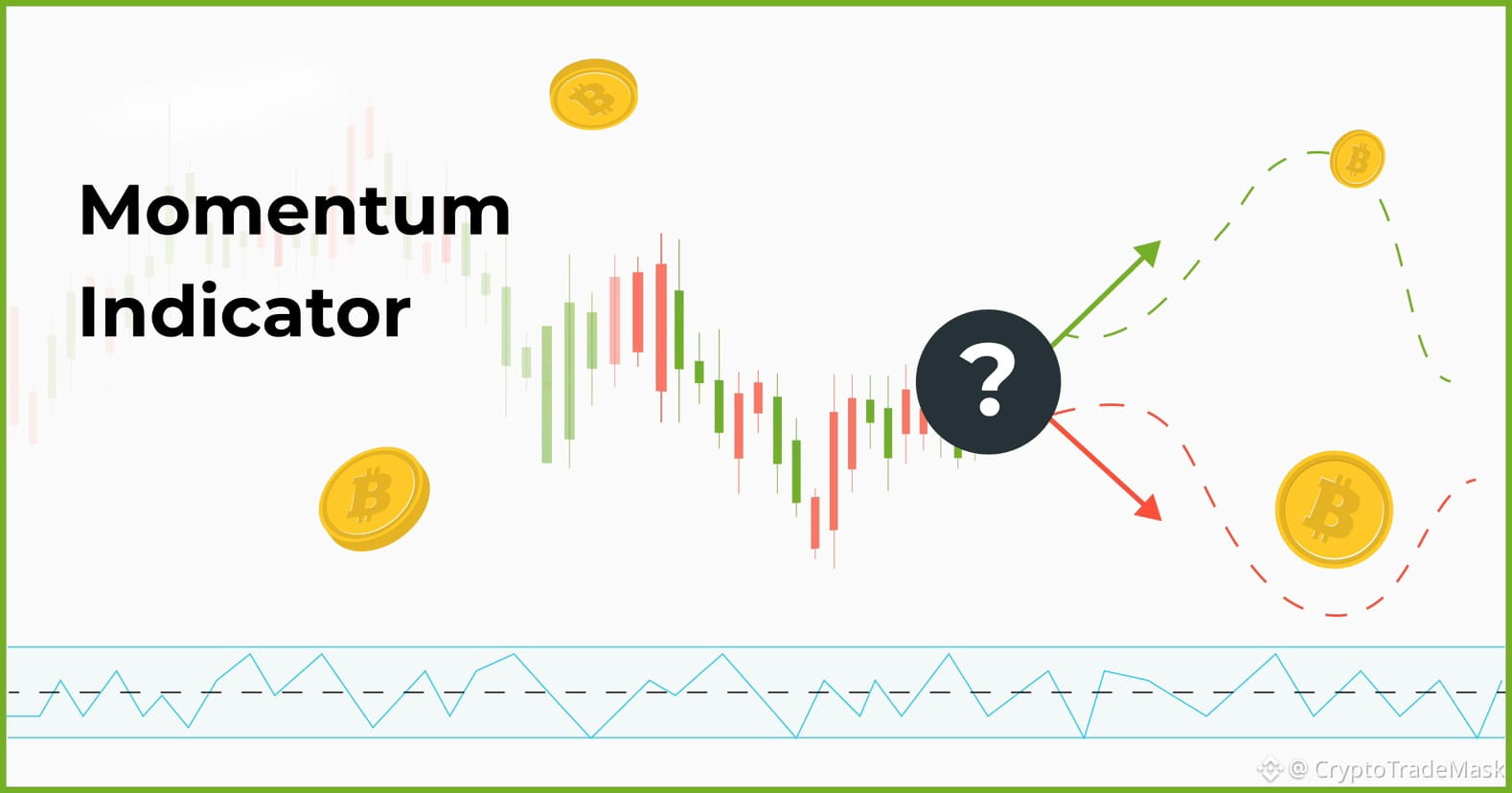 Momentum вимірює темп зміни ціни. Якщо ціна зростає і швидкість цього зростання збільшується — моментум зростає. Якщо ціна зростає, але повільніше, ніж раніше — моментум починає падати, що часто є випереджальним сигналом до розвороту або консолідації.