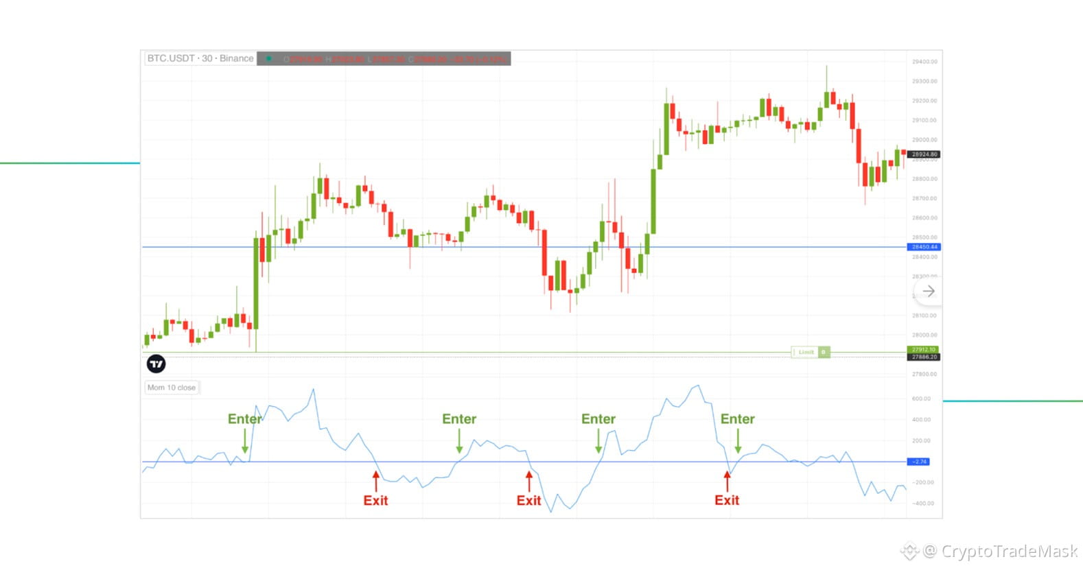 3. Перетин лінії: Коли лінія MOM перетинає нуль знизу вгору — це сигнал на купівлю. Згори вниз — сигнал на продаж.