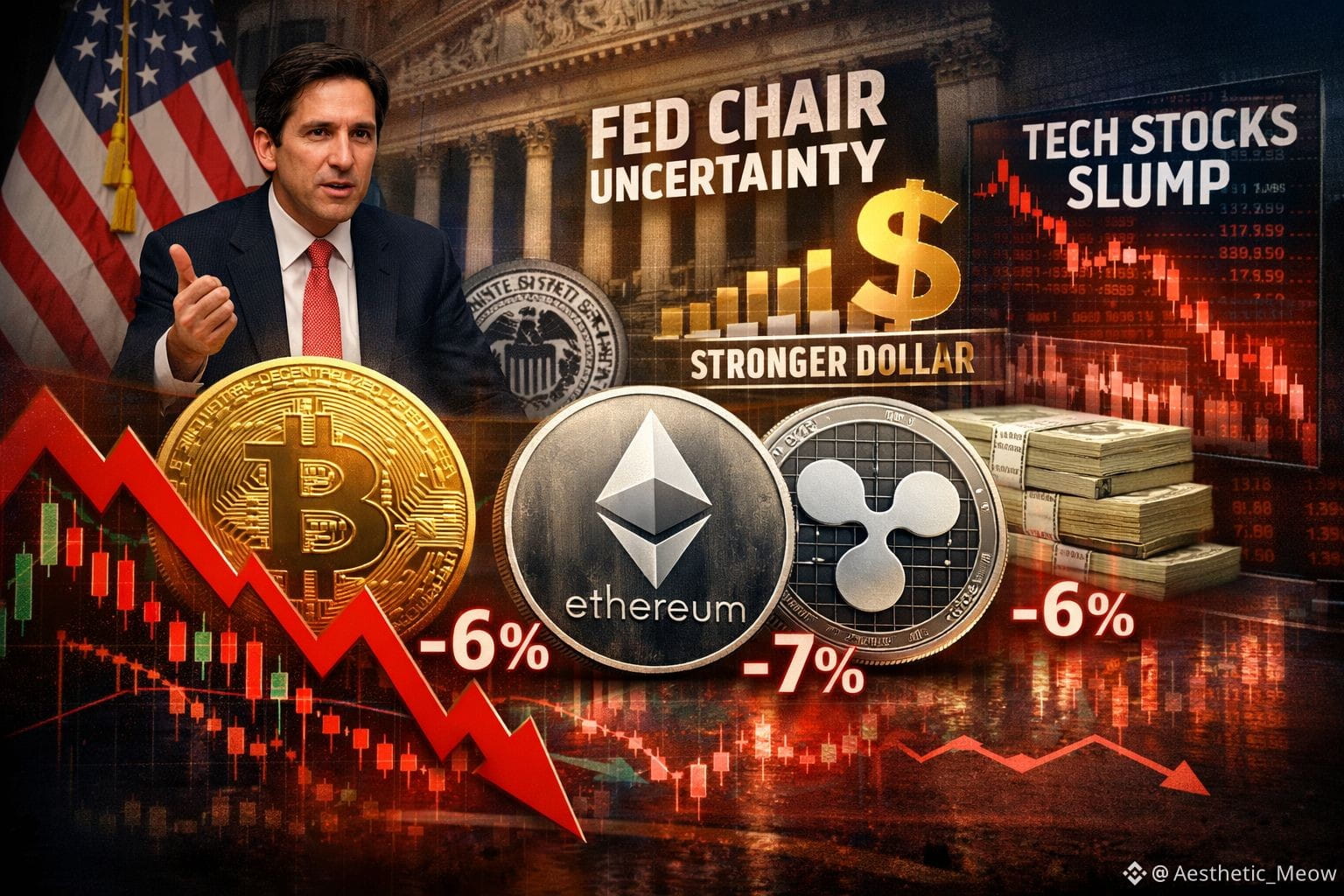 Bitcoin fell about 6 percent, trading near $82,600–$83,000 after dropping lower in recent trading. Ethereum was down approximately 6–7 percent, and XRP dropped around 5–6 percent. These drops followed earlier weakness, with the overall digital asset market losing considerable value as macroeconomic expectations shifted.