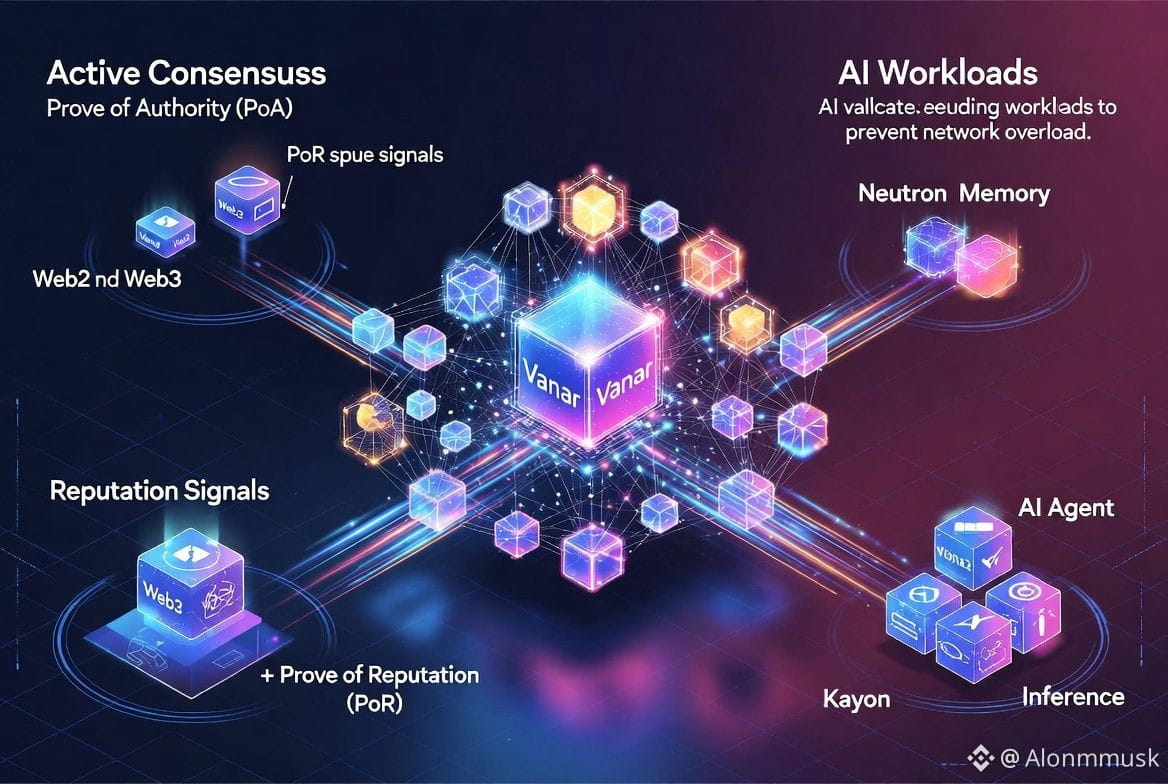 Vanar runs as an EVM-compatible Layer 1, but the consensus setup is not typical. It uses PoA combined with a Proof of Reputation system. Validators are selected based on reputation signals from both Web2 and Web3, at least in the early stages. That is a conscious trade-off. Less decentralization early on in exchange for faster execution and more predictable behavior. For AI workloads, that trade-off makes sense. Long settlement uncertainty is a problem when agents are running live. Neutron handles memory so agents can keep context instead of resetting every session. Kayon handles inference, keeping execution controlled so the network does not get overloaded.
