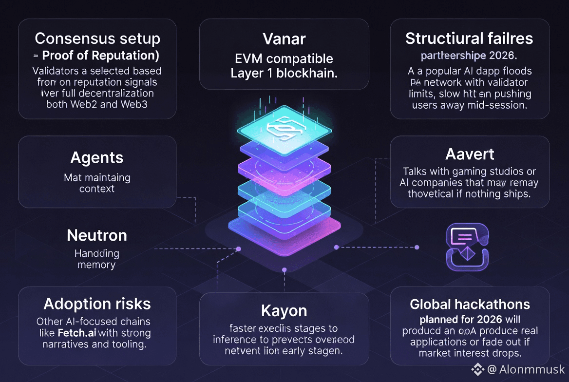 There are still clear risks. Other AI-focused chains like Fetch.ai already have strong narratives and tooling. Builders could leave if Vanar does not decentralize fast enough. Adoption risk tends to be tied to the brand partnerships planned for 2026. The behavior is predictable. Talks with gaming studios or AI companies sound good, but if nothing ships, it stays theoretical. Structurally, one obvious failure case is a popular AI dapp flooding the network with queries, hitting PoA validator limits, slowing execution, and pushing users away mid-session. It is also unclear whether the global hackathons planned for 2026 actually produce real applications or fade out if market interest drops.