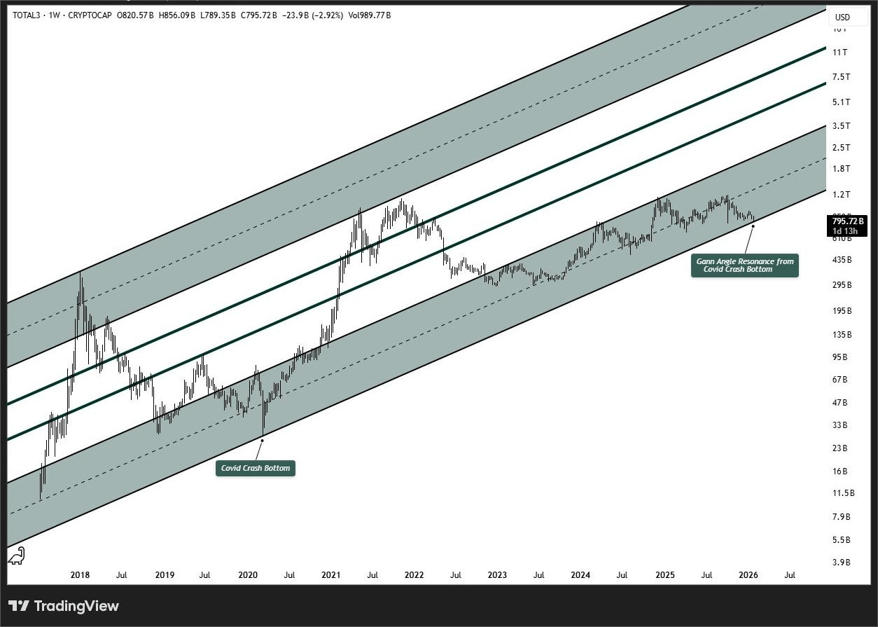 #total3 sedang duduk tepat di garis resonansi Sudut Gann yang digambar dari dasar kejatuhan Covid. Itu bukan level acak. Itu adalah jalur pertumbuhan struktural yang telah mendefinisikan siklus ini.