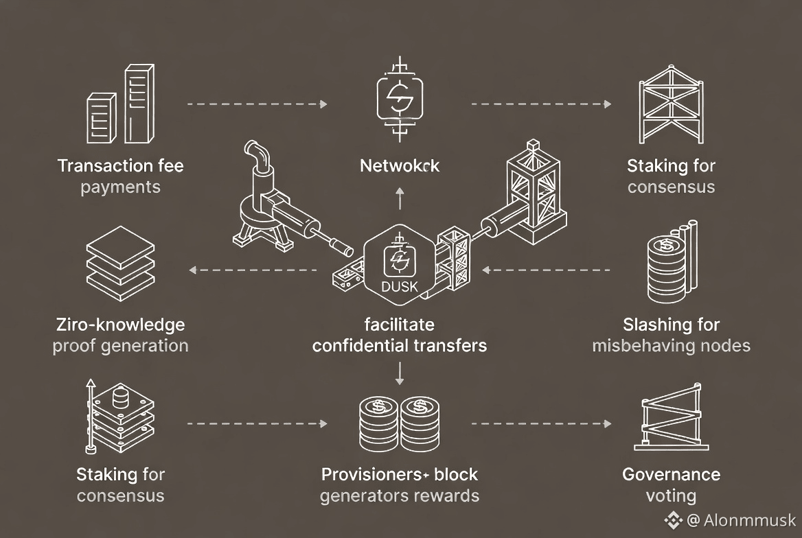 $DUSK as a token is mostly mechanical here. It pays transaction fees, which include the cost of generating zero-knowledge proofs and running the network. Structurally, staking ties into consensus, where users stake DUSK to act as provisioners or block generators and earn rewards. Settlement uses DUSK as the native unit for confidential transfers. From a systems perspective, governance also runs through it, with holders voting on protocol changes like tuning ZK parameters. Security incentives are backed by staking and slashing when nodes misbehave. Nothing flashy, just infrastructure roles.