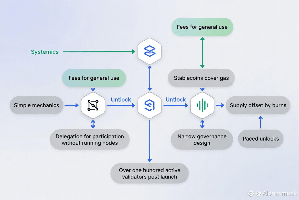 $XPL mechanics stay simple. Fees for general use. Stablecoins can cover gas. Burns offset supply. Delegation allows participation without running nodes. Governance is narrow by design. Unlocks are paced. Over one hundred validators are active post launch. Throughput has crossed one thousand TPS in testing.