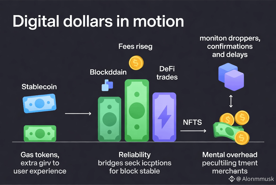That small hassle pushed me to think more broadly about how digital dollars actually move. The issue is not stablecoins themselves. They do their job. The issue is the rails underneath. Most blockchains were never designed with stablecoin payments as the primary use case. They are general purpose systems trying to handle everything at once. DeFi trades, NFTs, experiments, all competing for the same block space. Stablecoin transfers get caught in that noise. Fees rise because the network has to price in complex execution. Reliability drops when blocks fill up. Finality becomes unpredictable. UX adds friction with gas tokens, bridges, and extra steps that feel unnecessary when all you want to do tends to be send money. The cost is not just fees. It is the mental overhead of watching confirmations and worrying about delays. That is not ideal for remittances or merchant settlements where predictability matters most.