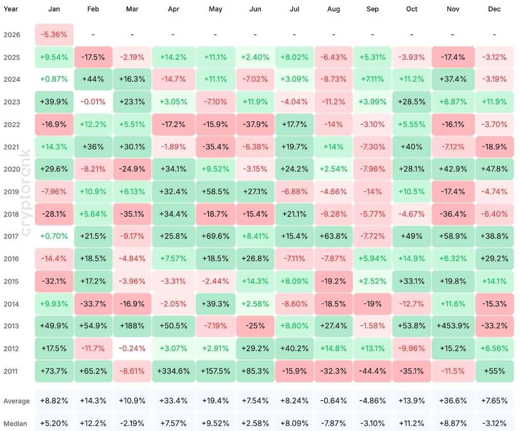 Analisis pengembalian bulanan Bitcoin dari 2011 hingga 2026 menunjukkan bahwa Februari secara historis merupakan bulan positif - hanya empat tahun mengalami kerugian. Hasil positif tertinggi di bulan Februari terjadi pada tahun 2011 (+65,2%), 2013 (+54,9%), dan 2024 (+44%), sementara penurunan terbesar terjadi pada tahun 2014 (-33,7%) dan 2025 (-17,5%).