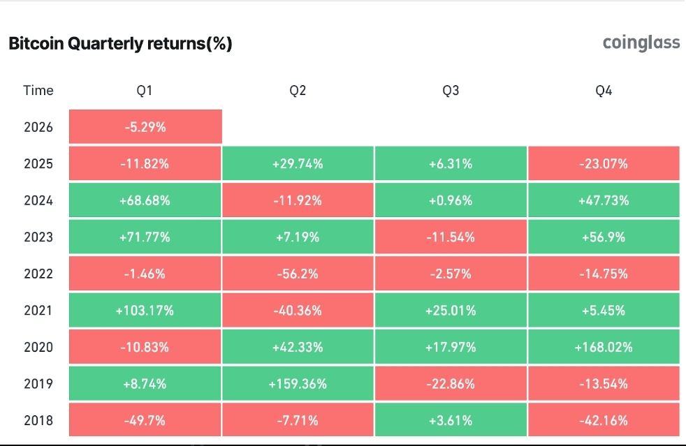 Bulan pertama tahun sering kali menentukan nada untuk kuartal pertama. Secara historis, menurut data Coinglass, kinerja bitcoin di kuartal pertama dapat bervariasi: beberapa tahun disertai dengan lonjakan tajam, yang lain - koreksi tajam. Misalnya, data menunjukkan bahwa di kuartal pertama tahun 2021, pertumbuhannya mencapai +103,17%, sedangkan di kuartal pertama tahun 2018, penurunannya mencapai -49,7%.