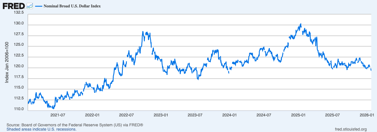 Crypto hates when short-term yields and the dollar grind higher together. 2Y yields are stable around 3.53-3.60 lately, and the broad USD index is weakening to ~119.