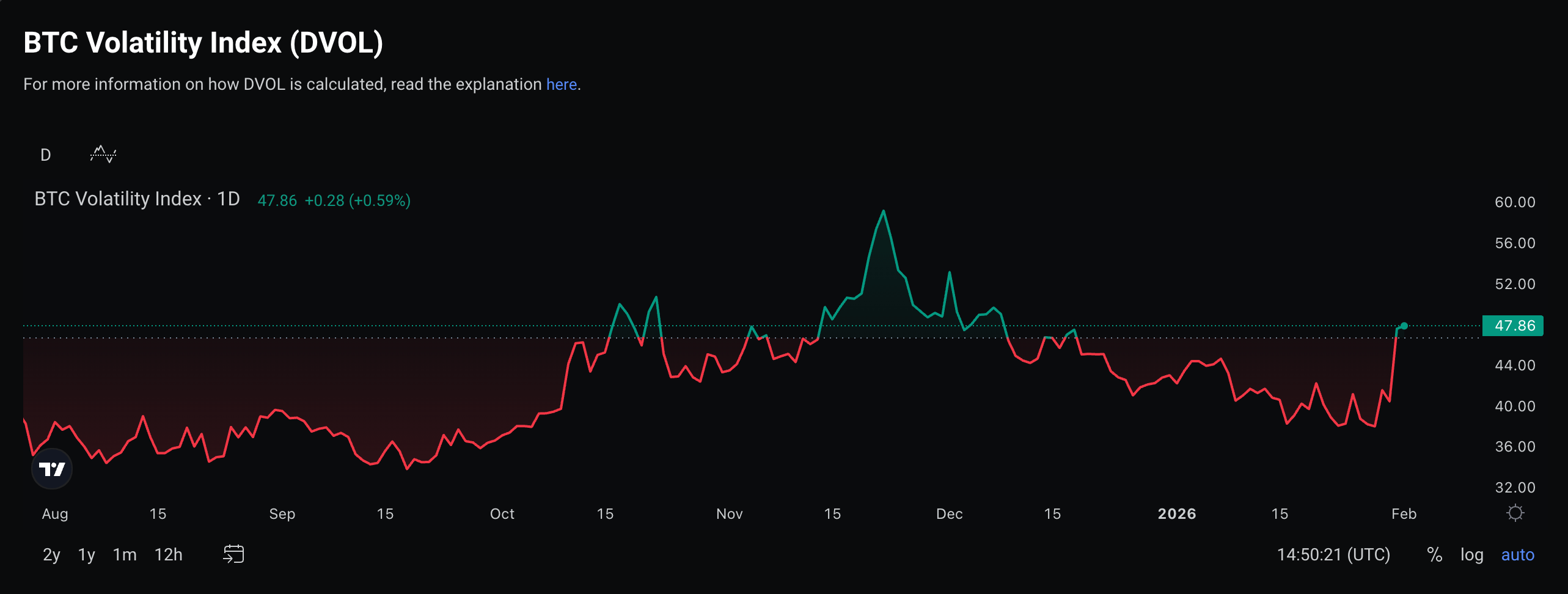 Implied vol climbing means uncertainty is still priced in. Current DVOL at 46.70 with no recent change.