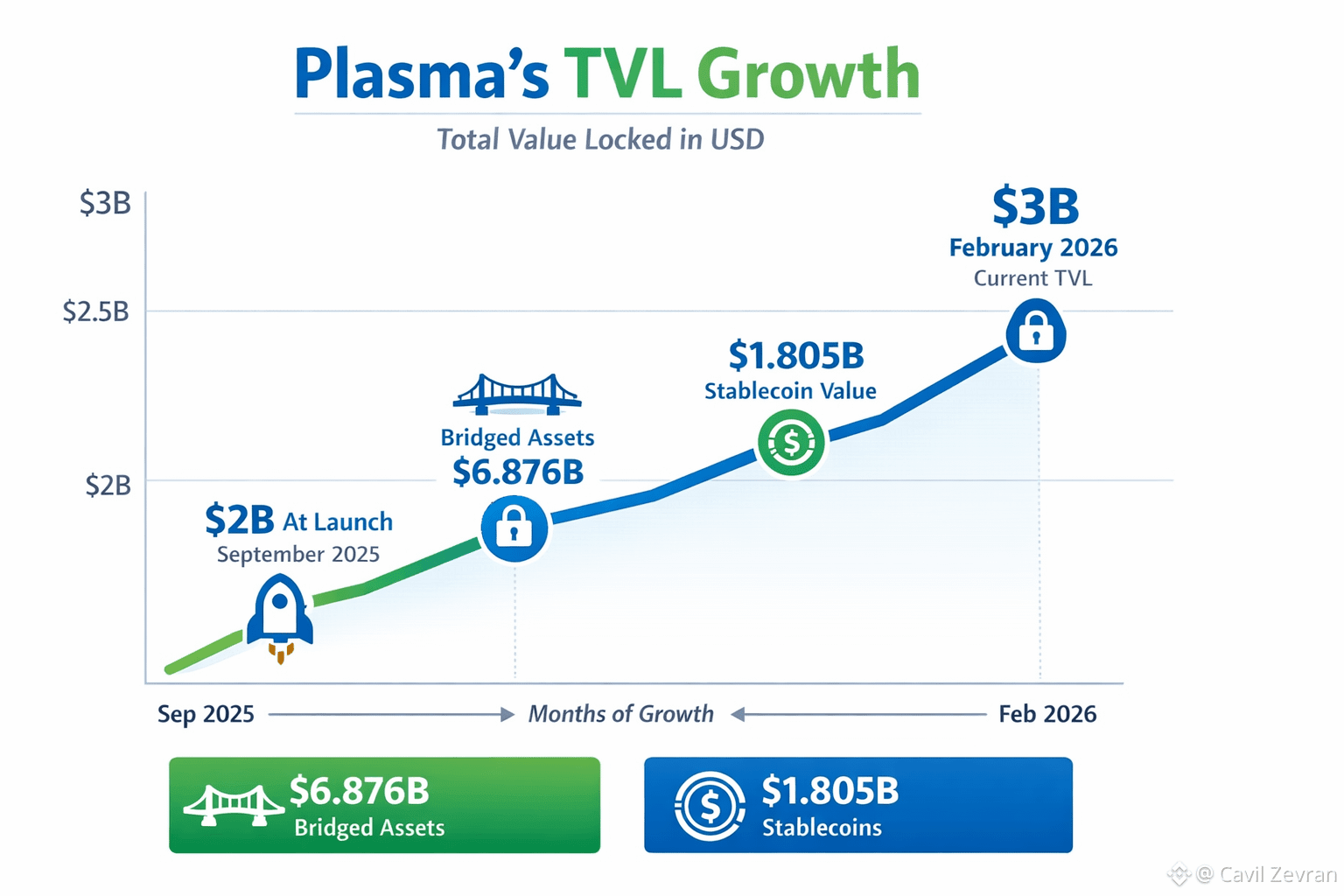 Analyzing the data of DefiLlama as of February 2026, the TVL of Plasma is now 3.005 billion, which is almost twice the amount at the time of its launch (2 billion). This growth accounts to bridged assets of 6.876 billion and native assets of 4.665 billion which indicates great liquidity inflows.