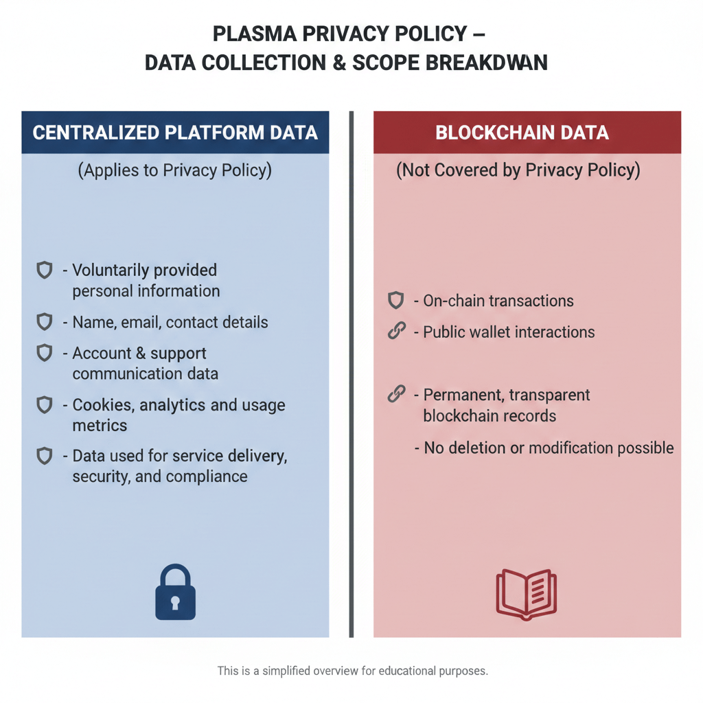 Kebijakan Privasi Plasma memberikan garis besar formal tentang bagaimana data pengguna diproses dan apa yang diharapkan orang dalam konteks hukum privasi yang ada, cookie, dan transparansi blockchain. Ini menjelaskan bahwa transaksi desentralisasi dan data on-chain secara inheren bersifat publik, dan pengumpulan data pribadi terutama terjadi pada bagian yang terhubung dengan fitur platform terpusat dan akun pengguna.