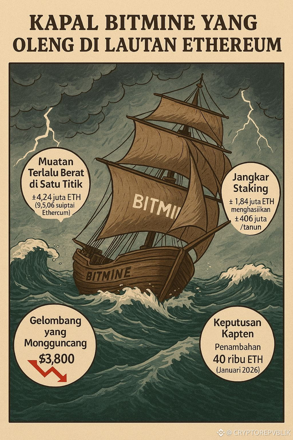 🤔 Bayangkan sebuah kapal raksasa bernama Bitmine berlayar di samudra kripto. Kapal ini penuh muatan: jutaan Ethereum yang dikumpulkan dengan keyakinan bahwa lautan akan selalu tenang. Namun, badai datang tiba-tiba. Harga $ETH jatuh dari $3.800 ke $2.300, dan kapal Bitmine kehilangan 41% dari bobot kekayaannya. Dari muatan senilai $15,7 miliar, kini hanya tersisa sekitar $9,2 miliar.