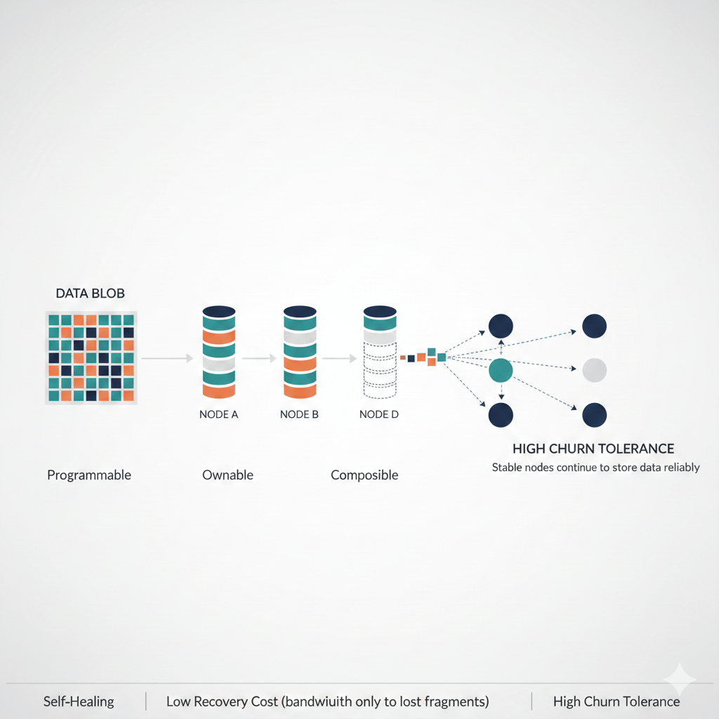 Keputusan untuk berfokus pada penyimpanan blob terdistribusi yang dipasangkan dengan pengkodean penghapusan dibaca sebagai respons praktis terhadap kenyataan itu. Ini memperlakukan kegagalan sebagai hal yang normal daripada luar biasa. Node yang offline, jaringan yang terfragmentasi, permintaan yang melonjak secara tak terduga, ini bukan kasus pinggiran di sistem nyata, mereka adalah dasar. Pengkodean penghapusan tidak mencoba untuk mencegah kegagalan; ia menganggap kegagalan dan merancang di sekitarnya. Pola pikir itu sendiri memberi tahu saya bahwa arsitektur ini dibentuk oleh pemikiran operasional daripada kemurnian papan putih.