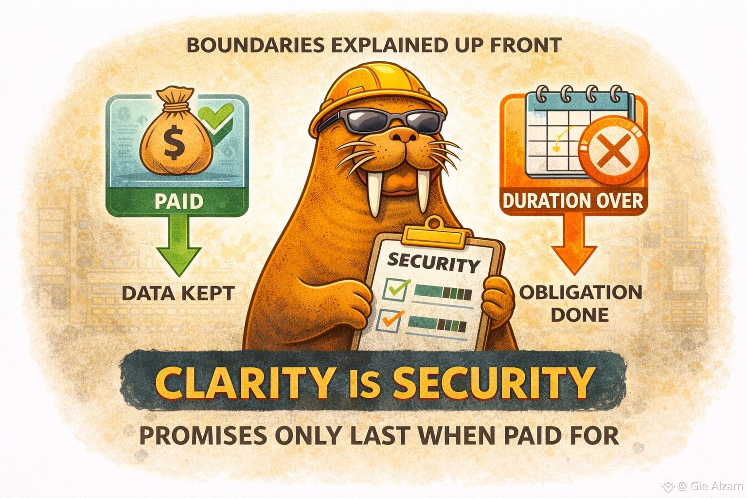Banyak sistem terdesentralisasi tumbuh dengan janji implisit yang kabur. Di atas kertas terlihat fleksibel, tapi di praktiknya sering meninggalkan ruang salah paham. Walrus memilih jalan yang lebih tegas: batas dijelaskan sejak awal.