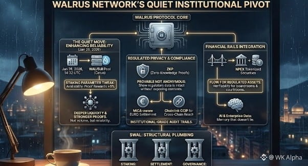 On January 26 2026 at 14:32 UTC the WAL/SUI pool on Cetus (address snippet 0x4f51...4528) got a staking parameter tweak availability-proof rewards up 5%. Nothing flashy no big press release just a quiet adjustment that pulled more node operators in and deepened liquidity. That single change keeps the proofs of availability stronger which is the backbone of everything else Walrus is building. It’s not about volume spikes it’s about reliability that survives downturns.