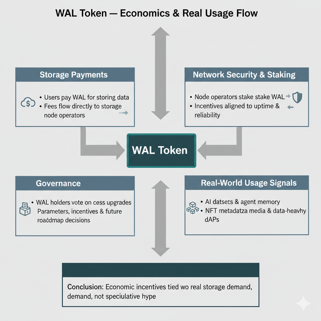 Token WAL adalah tulang punggung ekonomi ekosistem. Biaya untuk menggunakan penyimpanan dibayar dalam WAL, yang langsung diterima oleh operator node penyimpanan dan staker. Ini menciptakan struktur insentif yang jelas di mana penggunaan jaringan dan hadiah saling terkait. Model ini memberi penghargaan pada penggunaan aktual, bukan spekulatif.