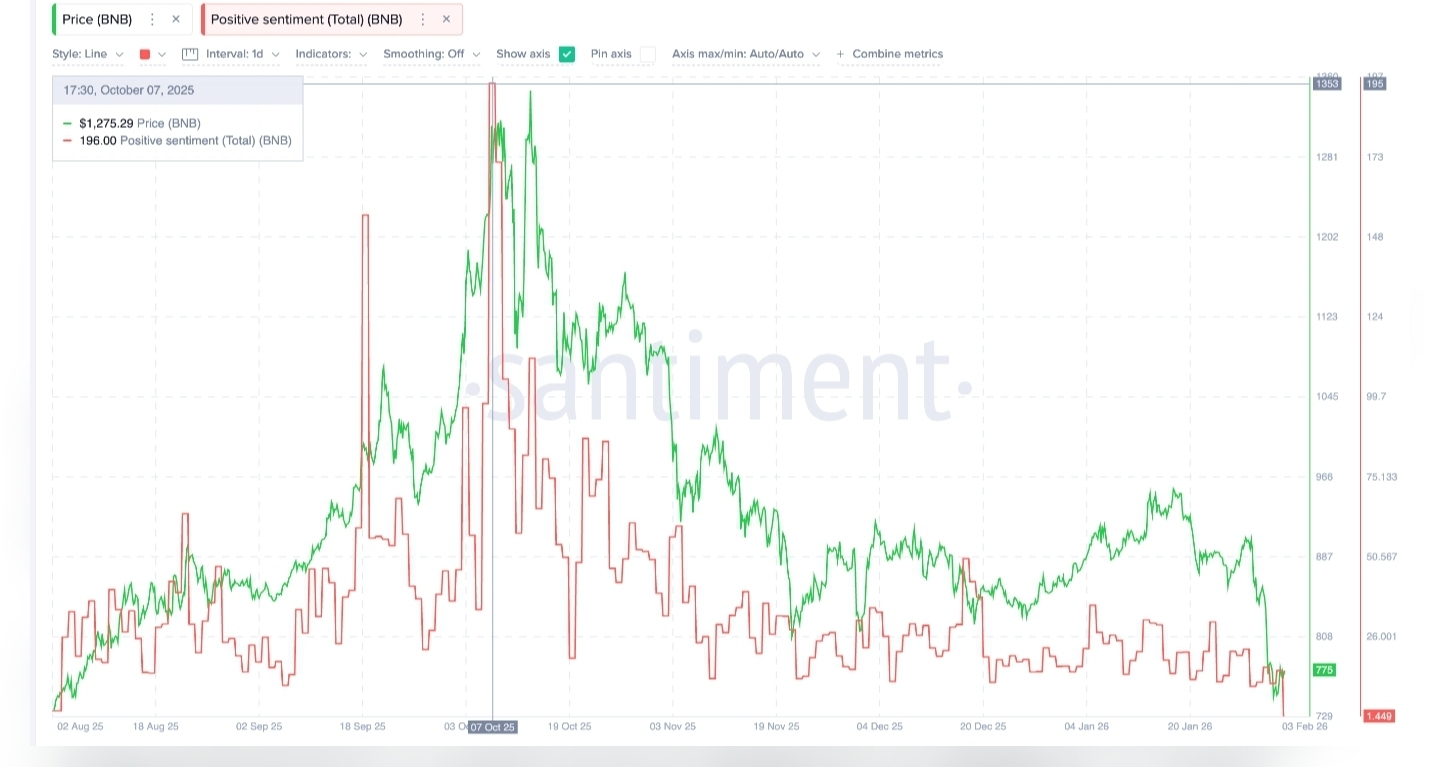 Kelemahan utama berasal dari sentimen. Skor sentimen sosial positif sekitar $BNB telah jatuh menjadi sekitar 1,44, terendah dalam enam bulan, turun dari puncak mendekati 196 di bulan Oktober. Secara historis, lonjakan sentimen lokal telah mendahului pemulihan. Metrik ini melacak volume sebutan positif di media sosial seputar $BNB.