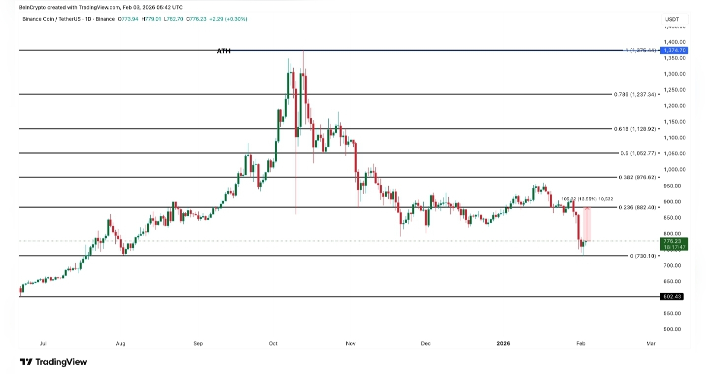 Dalam beberapa minggu terakhir, sensitivitas ini telah terlihat. $BNB telah turun sekitar 12% dalam sebulan terakhir dan sekarang diperdagangkan di dekat $776, turun dari puncak Oktober sekitar $1.370, menjadikannya sekitar 43% di bawah rekor tertinggi sepanjang masa.