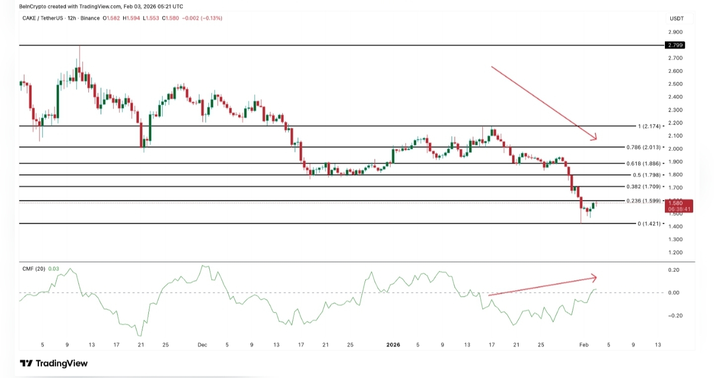 Indikator aliran modal memperkuat tren ini. Chaikin Money Flow (CMF), yang melacak uang yang bergerak masuk atau keluar dari suatu aset berdasarkan harga dan volume, telah meningkat sejak pertengahan Januari. Dari 17 Januari hingga 3 Februari, harga $CAKE menurun, namun CMF naik di atas nol. Divergensi bullish ini menunjukkan bahwa investor besar mengakumulasi selama kelemahan, tidak hanya dalam 24 jam terakhir.