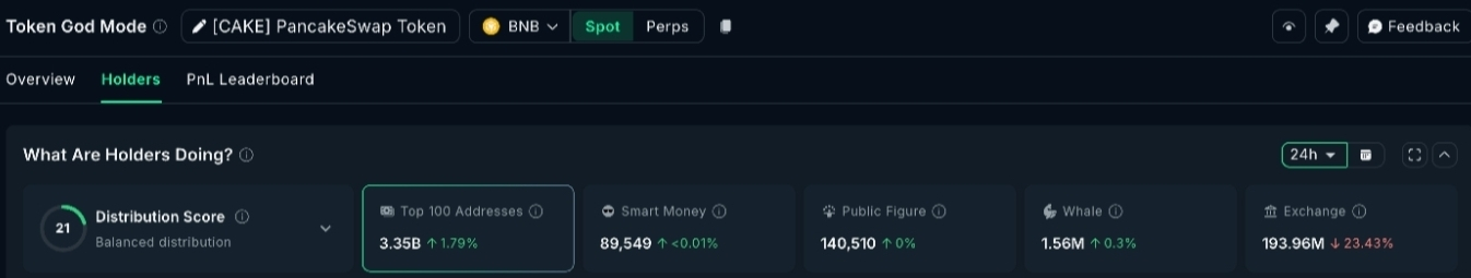 Metrik on-chain menunjukkan akumulasi yang konsisten. Dalam 24 jam terakhir, 100 dompet teratas meningkatkan kepemilikan $CAKE mereka sekitar 1,79%, sementara token di bursa turun hampir 23,4%. Ini menunjukkan bahwa baik pemegang besar maupun mungkin investor ritel diam-diam membangun posisi di $CAKE.