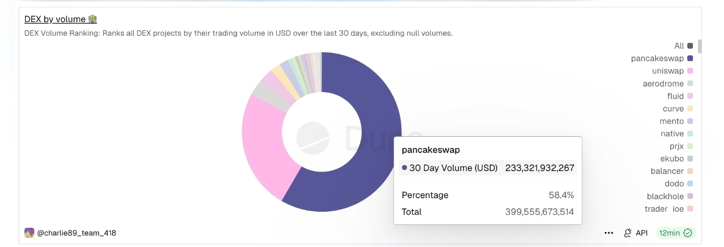 Meskipun ada kritik terbaru seputar Binance dan jatuhnya pasar Januari, PancakeSwap terus mendominasi aktivitas perdagangan terdesentralisasi. Selama 30 hari terakhir, ia mengendalikan sekitar 58,4% dari total volume DEX, jauh di depan Uniswap yang sekitar 24%.