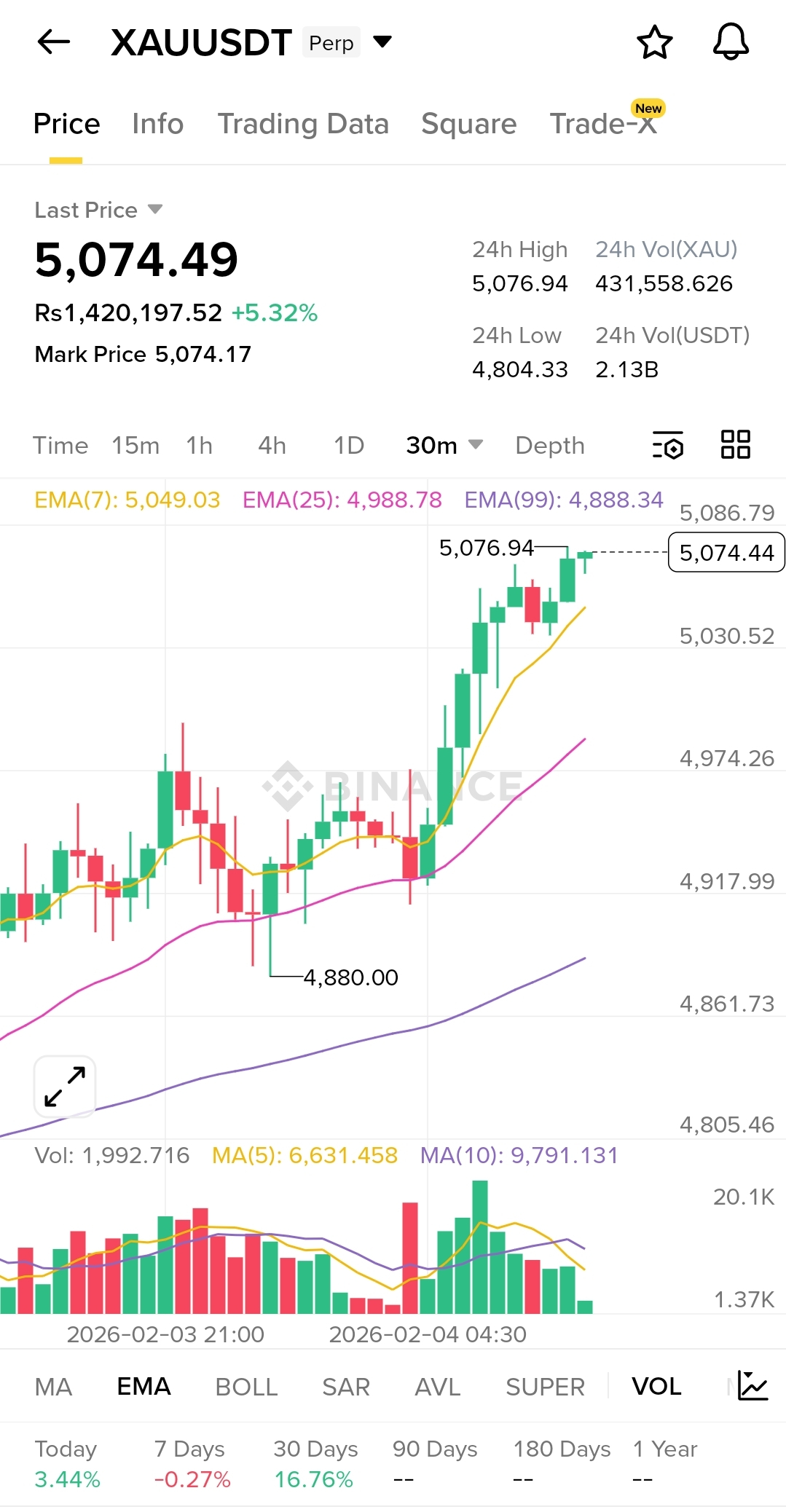 XAUUSDT saat ini menunjukkan momentum bullish yang kuat pada timeframe 30 menit dan lebih tinggi, didukung oleh breakout yang jelas di atas zona resistance kunci dekat 5.000. Harga diperdagangkan di atas EMA(7), EMA(25), dan EMA(99), yang mengonfirmasi struktur tren naik yang sehat dan kontrol pembeli yang kuat. Lilin impulsif terbaru dari 4.880 hingga 5.076 mencerminkan partisipasi institusional dan sweeping likuiditas stop-hunt yang diikuti dengan kelanjutan. Ekspansi volume selama lilin bullish lebih lanjut memvalidasi gerakan ini. Selama harga bertahan di atas rentang support 5.000–4.980, tren tetap bullish. Konsolidasi yang berhasil di atas zona ini dapat memicu fase ekspansi lain menuju 5.120 dan 5.180. Indikator RSI dan momentum menunjukkan kekuatan tanpa kelelahan ekstrem, yang berarti kelanjutan secara teknis lebih diutamakan daripada pembalikan. Struktur keseluruhan adalah higher highs dan higher lows, menunjukkan bahwa pembeli yang mengikuti tren dominan dan penurunan kemungkinan akan dibeli secara agresif. Dari perspektif fundamental dan Forex Factory, Emas mendapatkan kekuatan karena meningkatnya ketidakpastian dalam data makroekonomi, melemahnya sentimen USD, dan ekspektasi penyesuaian suku bunga yang potensial. Data ekonomi AS yang lemah atau nada Federal Reserve yang dovish terus mendukung Emas sebagai aset safe-haven. Sentimen pasar tetap bullish karena risiko geopolitik dan kekhawatiran inflasi menjaga permintaan tetap tinggi. Jika momentum bullish berlanjut, XAUUSDT dapat menargetkan level resistance berikutnya di 5.120, 5.180, dan berpotensi 5.250 dalam jangka pendek. Namun, kegagalan untuk bertahan di atas 4.980 dapat memicu pullback korektif menuju 4.940–4.900. sebelum kelanjutan. Trader harus memperhatikan berita Forex Factory berdampak tinggi seperti USD CPI, NFP, dan pernyataan FOMC, karena volatilitas akan meningkat secara signifikan di sekitar peristiwa tersebut. Bias keseluruhan tetap bullish kecuali harga jatuh di bawah support struktur utama di 4.880. Tren, volume, dan fundamental sejalan mendukung pembeli, menjadikan XAUUSDT salah satu instrumen terkuat untuk diperhatikan di lingkungan pasar saat ini.