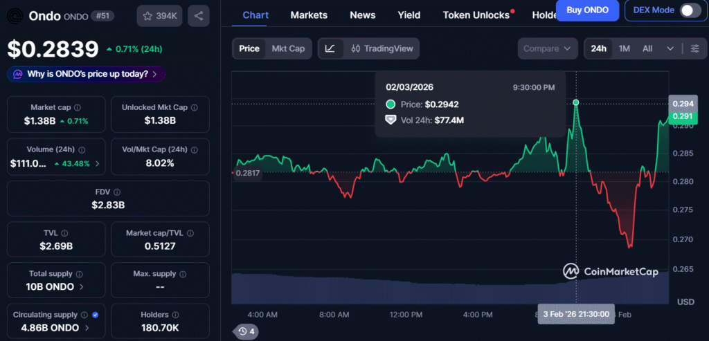 Token ONDO saat ini diperdagangkan di sekitar 0,28 dolar AS, yang menunjukkan pergerakan harga yang terbatas.