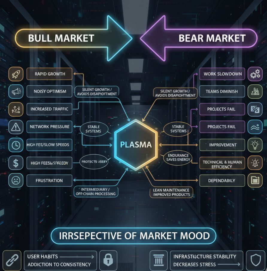 Setiap orang biasa di dunia blockchain memahami bahwa pasar bersifat siklik. Periode antusiasme, pertumbuhan cepat, dan optimisme yang bising diikuti oleh periode keraguan, koreksi, dan refleksi yang lebih tenang. Ada banyak teknologi yang menyala ketika keadaan baik dan memudar saat keadaan buruk. Plasma berbeda. Nilainya tidak terlihat jelas dalam hype, tetapi di saat-saat tekanan. Begitu pasar melambat dan minat menurun, Plasma akan terus melakukan tugas diam yang sama yang diciptakan untuk dilakukan, yaitu menjaga sistem tetap stabil dan melindungi pengguna.