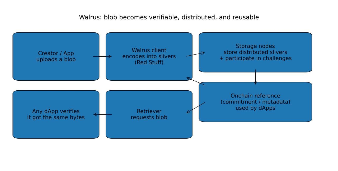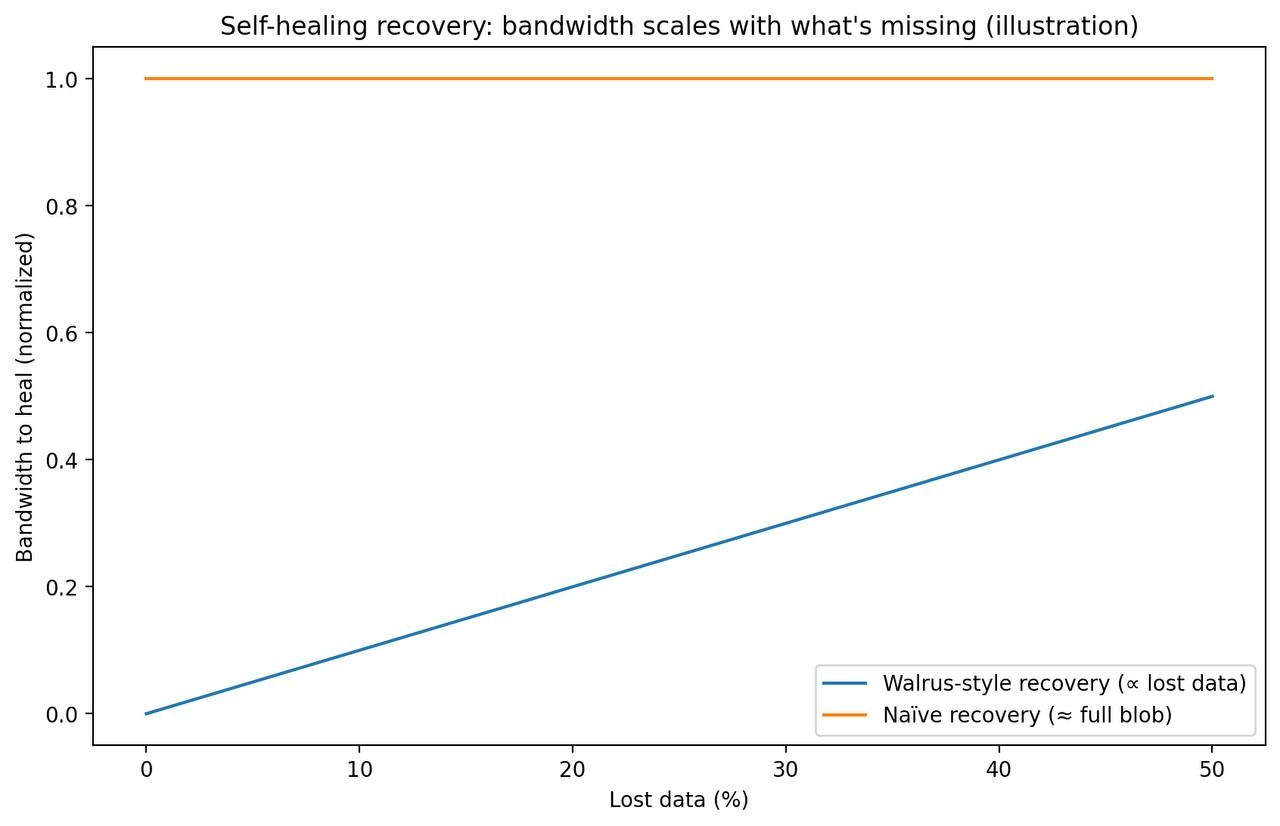 Anggap Walrus sebagai gudang untuk blob yang dapat diverifikasi. Bukan “percayalah, itu disimpan di suatu tempat,” tetapi “siapa pun dapat mengambil byte yang sama nanti dan membuktikan bahwa mereka cocok dengan apa yang dirujuk aplikasi.” Triknya adalah bahwa Walrus tidak mencoba untuk memaksa file besar ke dalam blockchain. Ia memperlakukan blob sebagai objek kelas satu, kemudian menggunakan skema redundansi yang dirancang dengan sengaja (Red Stuff, desain pengkodean penghapusan 2D) untuk menyebarkan potongan yang terkodekan di banyak node penyimpanan, sehingga blob bertahan dari churn dan pemadaman tanpa membayar harga penuh replikasi brute-force.