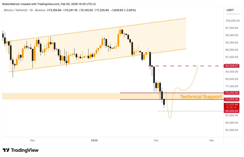 From a chart perspective Bitcoin already lost the 70k zone. That level mattered because it was both psychological and technical support. Once price lost it there was no strong bounce. That tells us demand is still waiting lower.