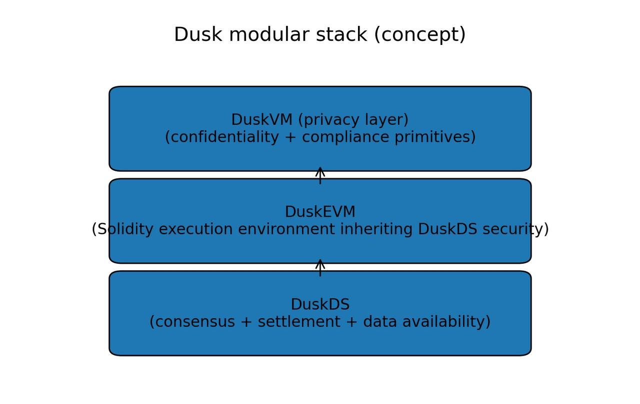 The architecture tells you they’re serious. Dusk has been evolving into a modular, multi-layer stack: a settlement layer (DuskDS) built for consensus, data availability, and finality, with an EVM execution environment (DuskEVM) on top for Solidity builders, and a privacy layer (often referenced as DuskVM) to bring confidentiality and compliance primitives into the same system. That’s not a cosmetic redesign; it’s an attempt to separate concerns the way financial infrastructure does: settlement stays robust and boring, execution stays developer-friendly, privacy stays explicit rather than “best effort.”