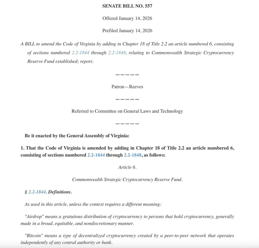 Virginia's SB557 is advancing to create the ‘Commonwealth Strategic Cryptocurrency Reserve Fund’ in the Treasury Department.