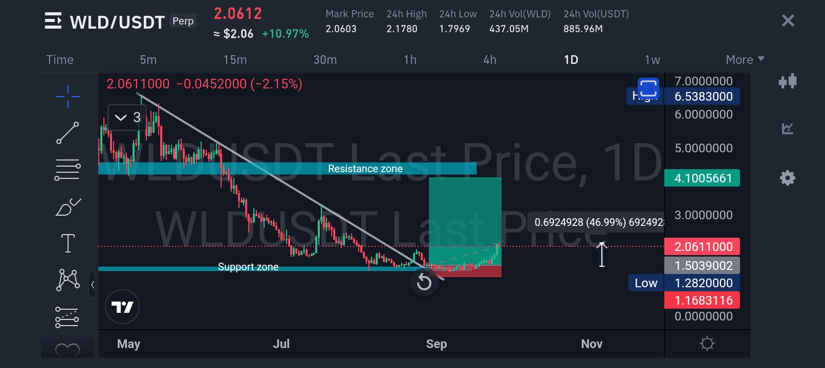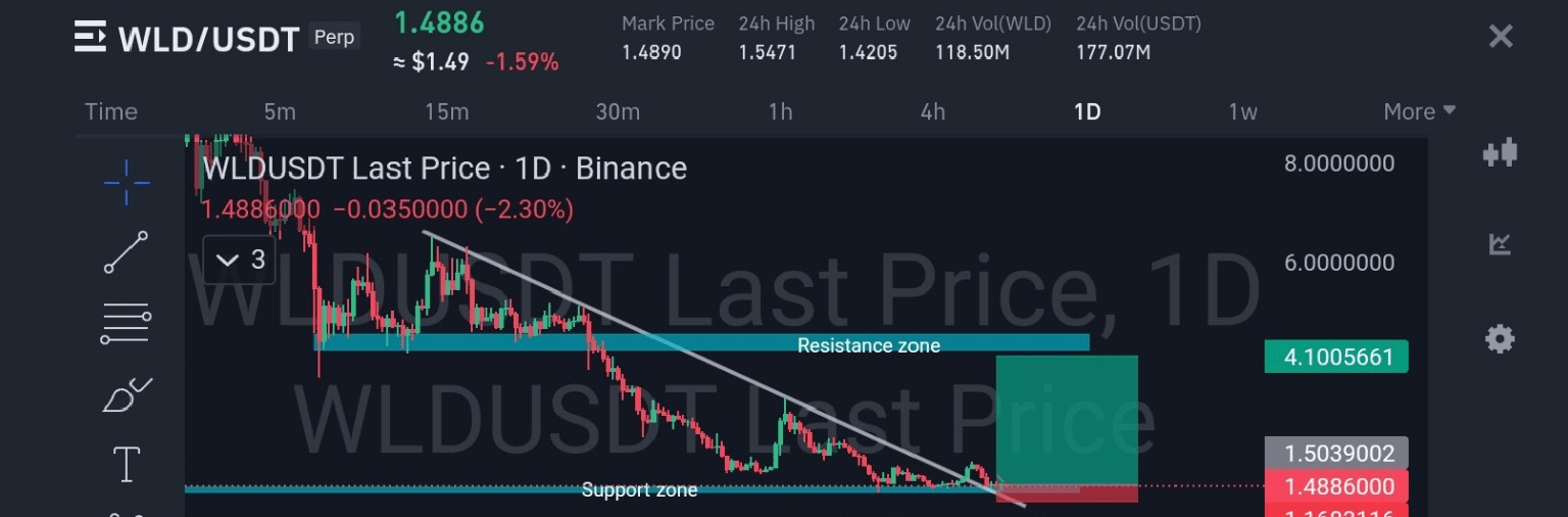 In precedenza ho condiviso un'analisi su WLD/USDT (vedi prima immagine) in cui ho evidenziato la possibilità di un significativo pump basato su indicatori tecnici forti. Il grafico mostrava il prezzo fermo nella zona di supporto, mentre una zona di resistenza in alto forniva un potenziale obiettivo per un movimento rialzista.