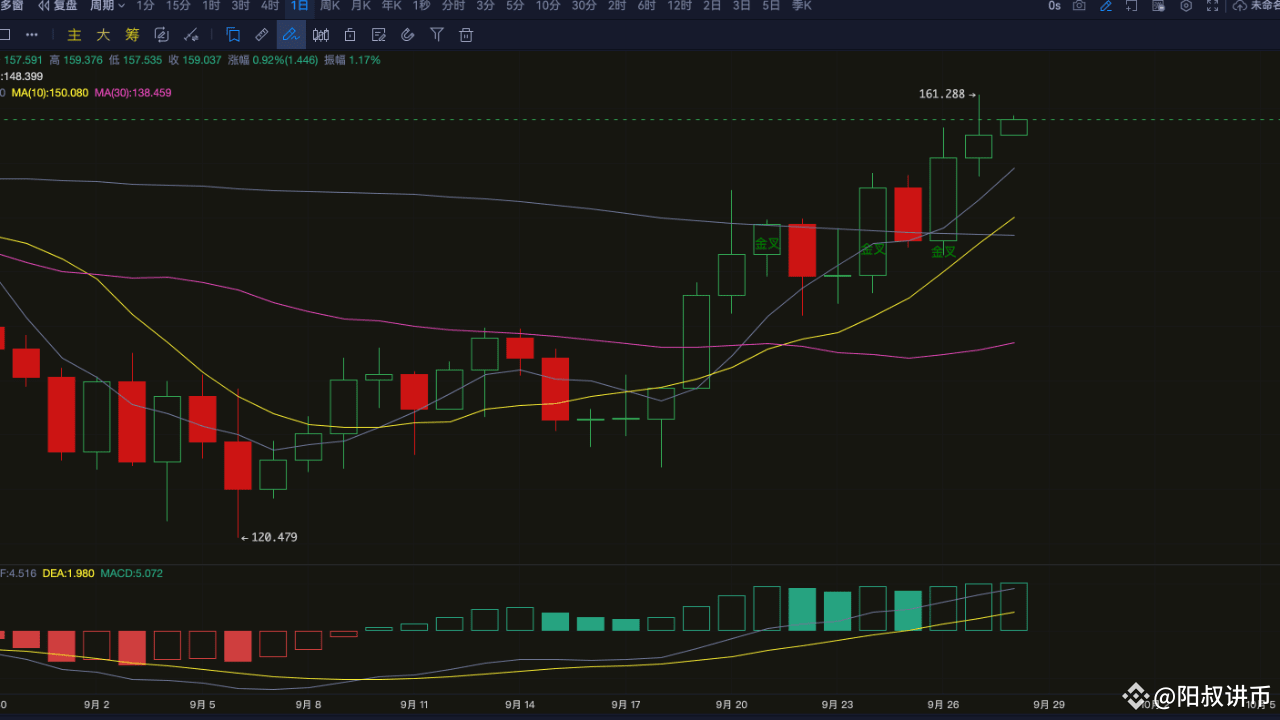 A giudicare dal grafico giornaliero, il prezzo attuale di SOL è di 159,3 dollari, avvicinandosi al livello psicologico chiave di 160 dollari. Le medie mobili di MA5 ($ 154,54) e MA10 ($ 150,08) formano una croce d'oro, indicando un forte slancio al rialzo a breve termine, e MA30 ($ 138,45) mantiene ancora una costante tendenza al rialzo. SOL aveva precedentemente formato un minimo graduale a $ 120,479 ed è rimbalzato completamente. Il prezzo si sta ora avvicinando al massimo precedente di $ 161,288. L'indicatore MACD mostra un evidente slancio rialzista, la linea DIF e la linea DEA continuano a divergere verso l'alto e lo slancio della colonna verde aumenta, mostrando un forte slancio al rialzo.