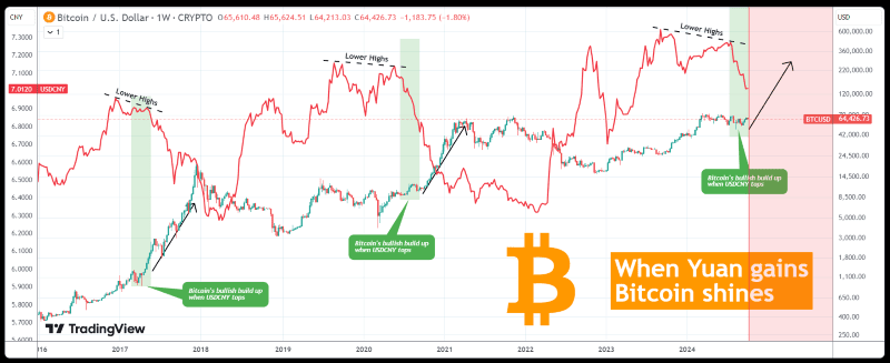 Infatti, secondo il grafico condiviso dall'analista, sviluppi simili si sono verificati nel 2017 e nel 2020 e il ciclo attuale è stato identico a quello del 2020, quando il prezzo della prima criptovaluta ha avviato un rally subito dopo che la coppia USDCNY ha raggiunto il suo massimo.