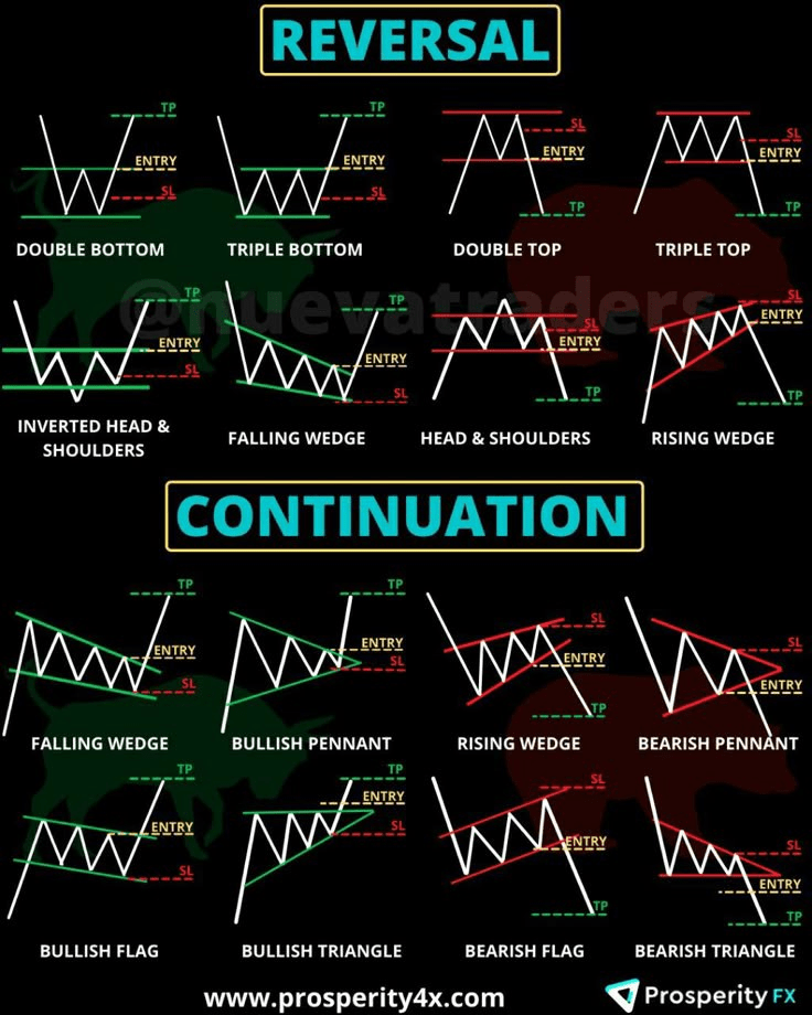 Nell'analisi tecnica, riconoscere i pattern dei grafici è fondamentale per prevedere potenziali movimenti di prezzo nei mercati, che si tratti di azioni, forex o criptovalute. Questi pattern aiutano i trader a identificare trend rialzisti o ribassisti e ad agire di conseguenza. L'immagine che hai fornito mostra alcuni dei pattern più cruciali, ognuno dei quali offre spunti su possibili direzioni dei prezzi. Immergiamoci nei dettagli di ogni pattern: