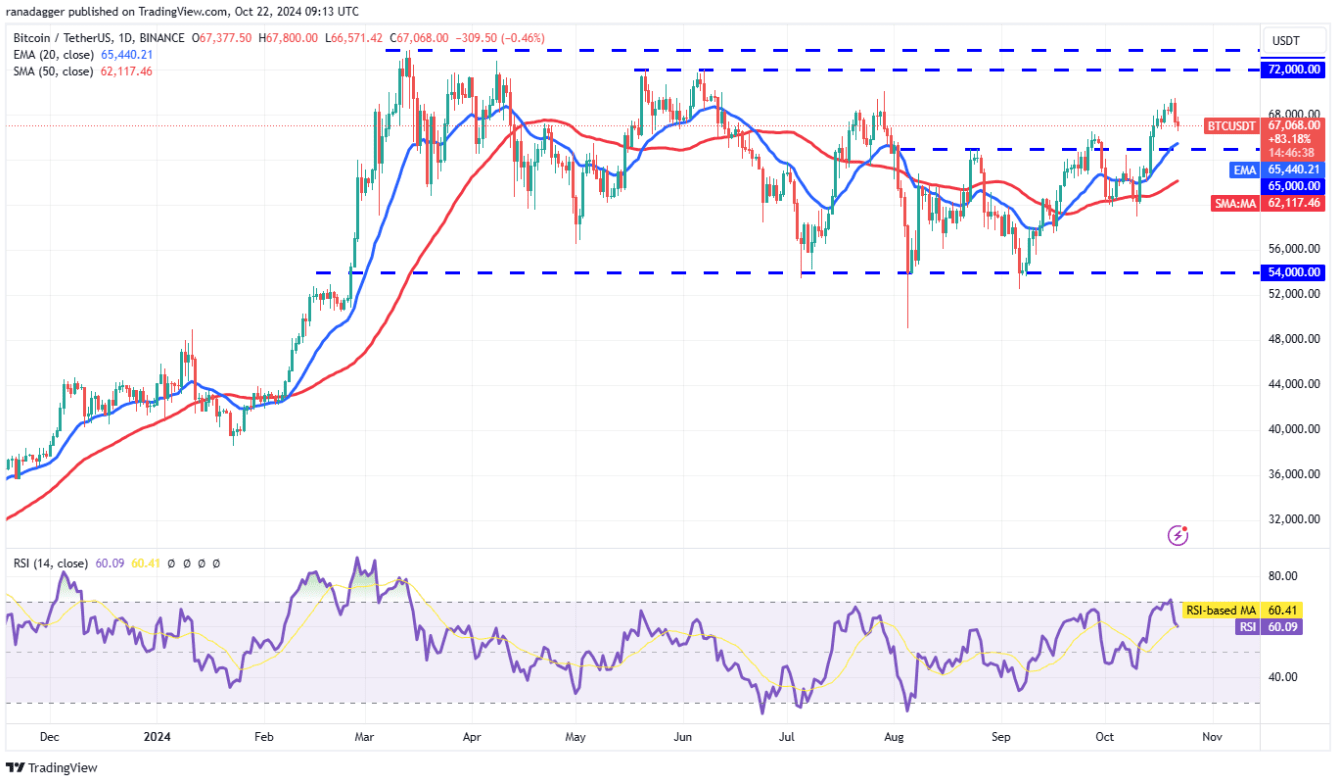 La zona compresa tra 66.500 e 65.000 dollari potrebbe fungere da supporto. Se il prezzo rimbalzasse fortemente da questa zona, segnalerebbe un fondo più alto, rafforzando le prospettive per un rally a 72.000 dollari. Tuttavia, i rialzisti potrebbero incontrare una dura resistenza compresa tra 72.000$ e 73.777$.