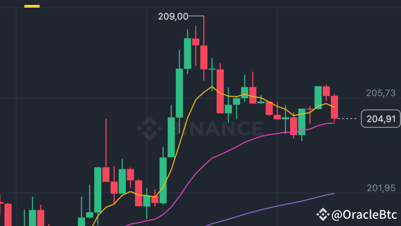 • Azione del Prezzo: SOL ha recentemente raggiunto un massimo di $209.00 prima di ritirarsi, con il prezzo attuale che si consolida sotto questa resistenza. La tendenza rimane cautamente rialzista mentre opera intorno alle medie mobili a breve termine.