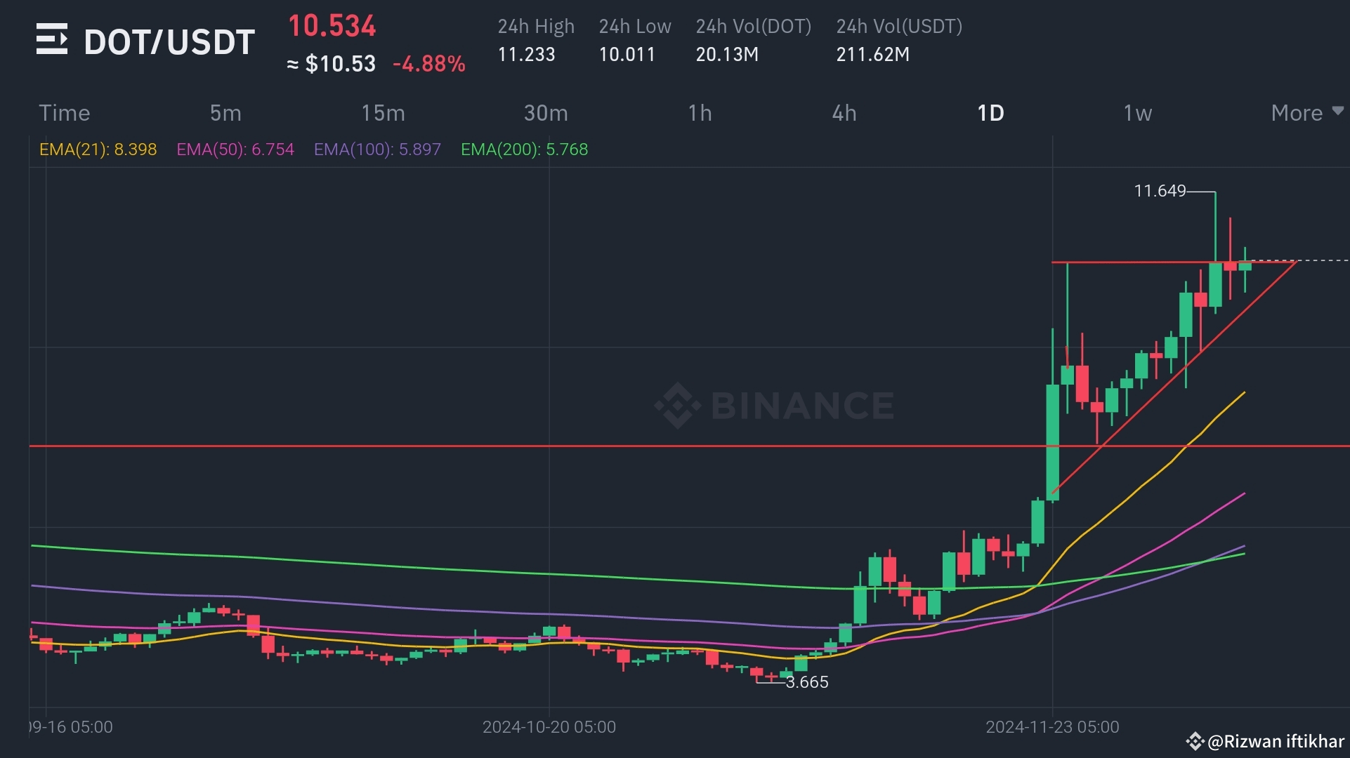 2. Media del costo in dollari: Accumula gradualmente DOT a vari punti di prezzo, specialmente se si avvicina al limite inferiore dell'intervallo previsto tra $10.00 e $10.501.
