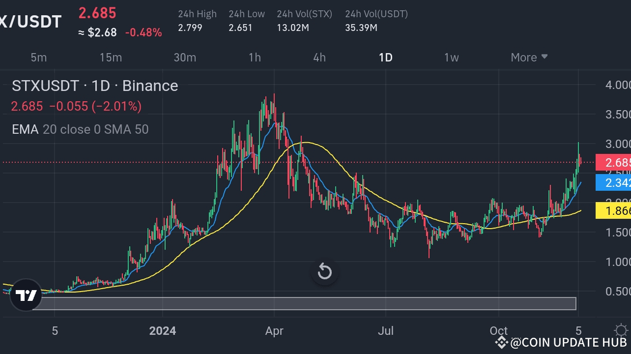 Al momento, STX/USDT è scambiato a $2.685, mostrando un leggero calo del 2.01% per la giornata. Nonostante il ritracciamento, la tendenza generale rimane rialzista. Ecco un'analisi dettagliata della struttura attuale del mercato, degli indicatori tecnici e dei potenziali prossimi movimenti per trader e investitori.