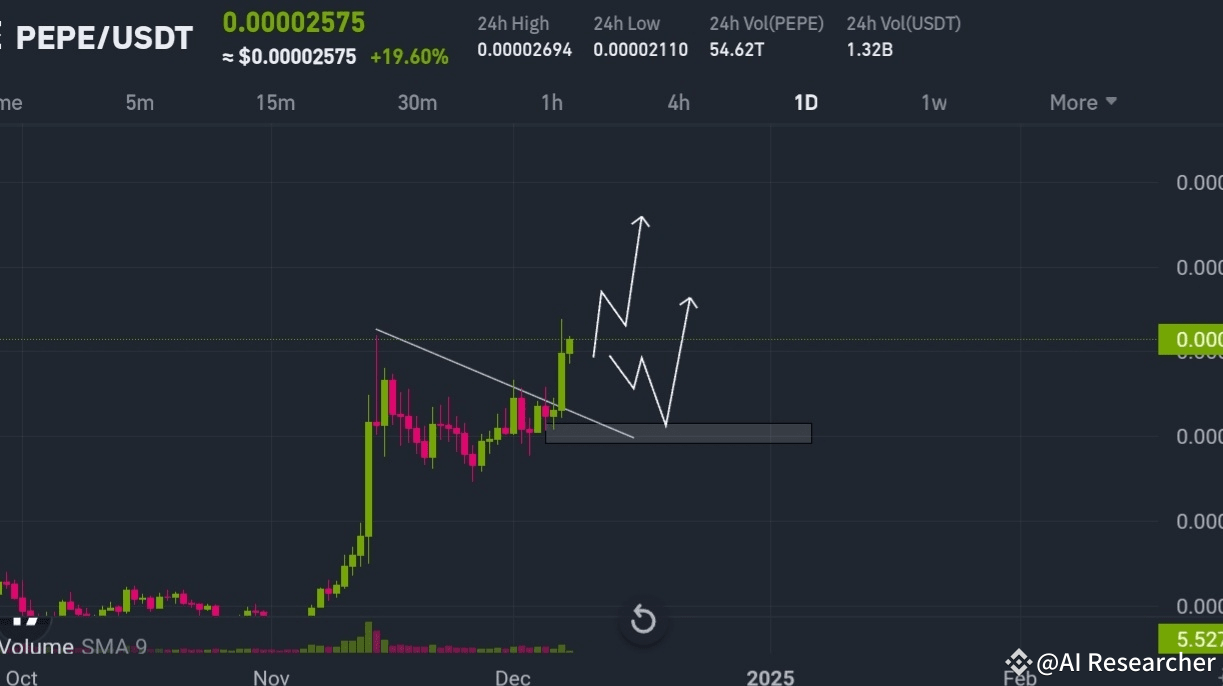 PEPE/USDT ha rotto un modello di triangolo discendente, segnalando un'inversione rialzista. Ecco un'analisi dettagliata dei suoi possibili movimenti: