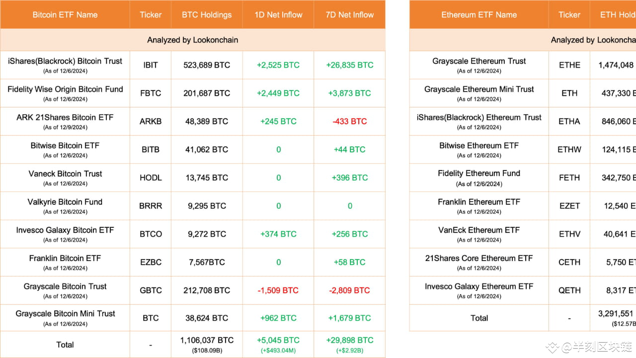Flusso netto di 10 ETF Bitcoin: +5.045 $BTC (+493,04 milioni di dollari) #BlackRock ha afflusso di 2.525 $BTC (246,76 milioni di dollari), attualmente possiede 523.689 $BTC (5,118 miliardi di dollari).